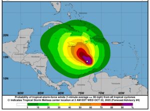 MIAMI.– La tormenta tropical Melissa continúa su desplazamiento lento hacia el suroeste del Caribe, acercándose a Haití y Jamaica, mientras los meteorólogos prevén un fortalecimiento gradual que podría convertirla en huracán este jueves.